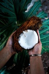Ce fruit, qui tombe de certains palmiers nommés « cocotiers », pousse sous les tropiques et offre une pulpe (albumen ou amande) et de l’eau (jus) à consommer sous plusieurs formes : l’eau, le lait, la crème, l’huile, le sucre, la poudre, les paillettes.